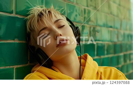 A woman in a yellow hoodie enjoys music through large headphones while basking in sunlight. Eyes closed, she relaxes against vibrant green tiles, embracing a serene and tranquil moment.