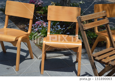 Wooden chairs on street / 春の日光浴のために路上に並べた木製チェアーたち