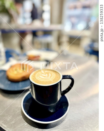 お洒落なカフェで楽しむラテアート付きのカフェラテとデニッシュの朝食セット