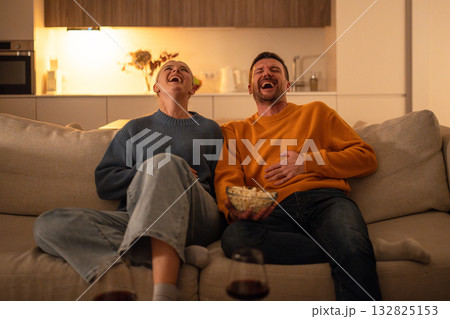 Laughing couple watch TV comedy with popcorn at night. Home theater entertainment in family