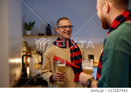 Waist up portrait of smiling sports fan talking to friend during after game party in home kitchen