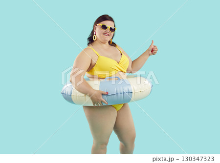 Chubby woman is satisfied with summer vacation and shows thumb up on light blue background.