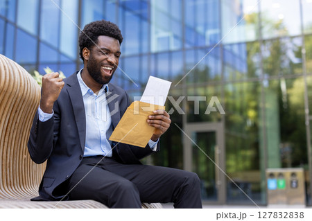 A young businessman cheers with his fist raised while sitting outside, having just opened a letter with great news in front of an office building