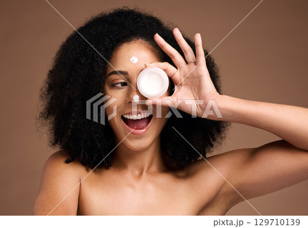 Cream container, skincare and black woman in studio happy for facial product, natural cosmetics or beauty mockup. African model with wow face for serum, collagen or dermatology sunscreen in her hand