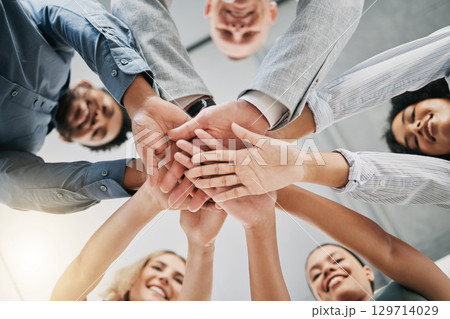 Team building, hands or happy business people with support, mission or goals for success in office building. Low angle, meeting or employees in partnership working with hope, team work or motivation
