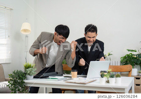 Celebration and Success. Two professionals celebrating a significant achievement in their modern office environment.