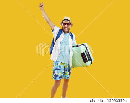 Funny young man in sunglasses with suitcase is going on summer holiday on yellow background.
