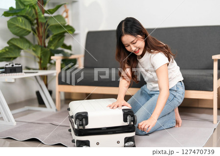 Travel Preparation. Young woman packing suitcase with excitement for upcoming trip.