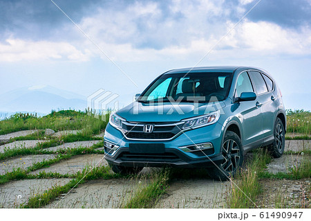 blue suv on a paved meadow
