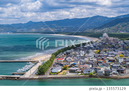佐賀県唐津市 鏡山展望台から眺める唐津城と唐津湾と虹の松原