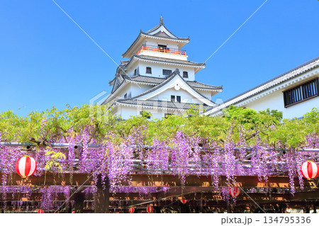 【佐賀県】晴天の唐津城天守閣と満開の藤棚