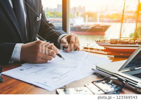海事代理士が船舶に関する書類を作成する様子のイメージ