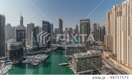 Panorama showing aerial view to Dubai marina skyscrapers around canal with floating boats