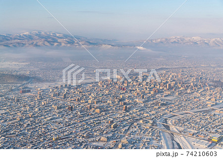 機窓・飛行機から眺める旭川の街並み・冬景色