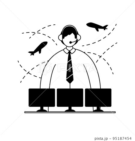Vector illustration of an air traffic controller with a headset on his head in front of monitors. Profession. Line art