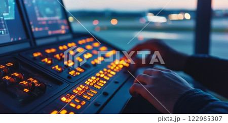 Air traffic controller managing airplane takeoff in airport control tower for flight safety