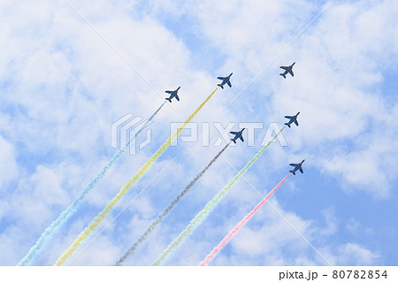デルタ隊形でスモークを引くブルーインパルス カラースモーク