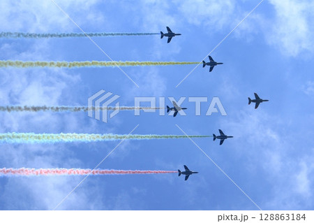 デルタ隊形でスモークを引くブルーインパルス カラースモーク