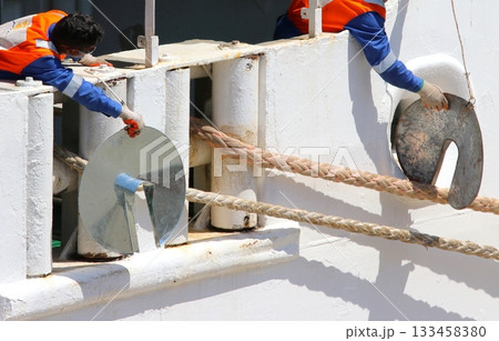 船の甲板、舫い綱の巻き取り作業中の乗組員
