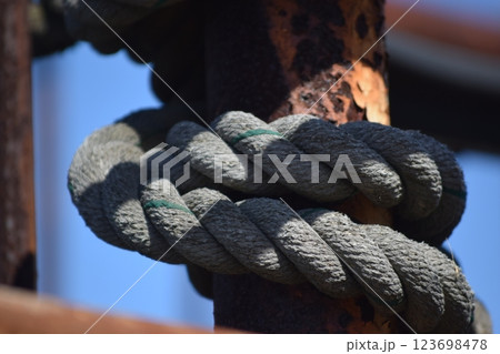 錆びた鉄柵の支柱に結ばれた古いロープ