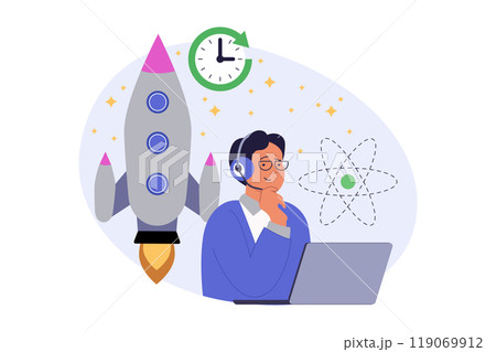 Science laboratory concept in modern flat design for web. Man works as technician at lab by laptop, monitoring astronomy spacecrafts and shuttles exploration and cosmos stations. Vector illustration.