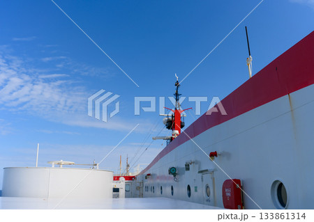 快晴の空の下、白と赤のフェリーデッキから見た船体とマスト