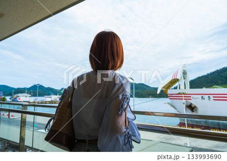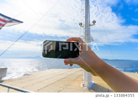 フェリーの甲板でスマートフォンを使い海と空