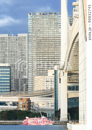 艇走中のジェットフォイル定期船と東京レインボーブリッジ