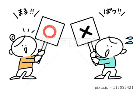丸とバツのプラカードを持つ人々 手描きイラスト