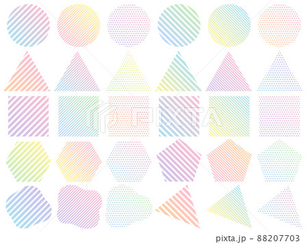 カラフルなグラデーションのドットとストライプ柄の色々な図形のアイコンセット