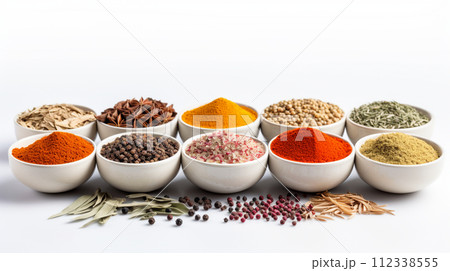 白いお椀に盛られて並べられた様々なスパイス AI画像