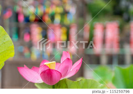 静岡県袋井市 可睡斎の境内に飾られる遠州三山風鈴まつりの江戸風鈴とハスの花