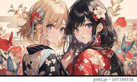 お祭りに繰り出した白と黒の浴衣をまとった二人の女性