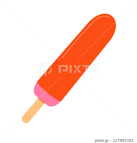 Ice cream on stick. Frozen juice on wooden stick, red fruity popsicle. Flat vector isolated illustration