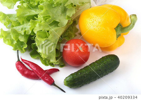 Assorted vegetables, fresh bell pepper, tomato, chilli pepper, cucumber and lettuce isolated on