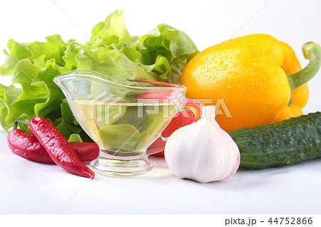Assorted vegetables, fresh bell pepper, tomato, chilli pepper, cucumber, olive oil, garlic and