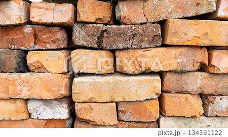 Red old brick wall background, brick wall texture. Stack of old weathered bricks used for construction or recycling.