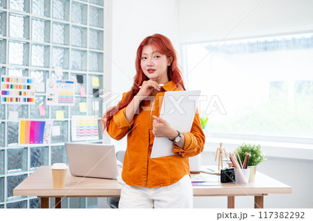 Beautiful young female designer using graphics tablet and working with color swatch samples at creative workstation