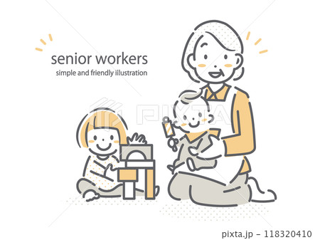 楽しくベビーシッターをするシニア女性 シンプルでお洒落な線画イラスト