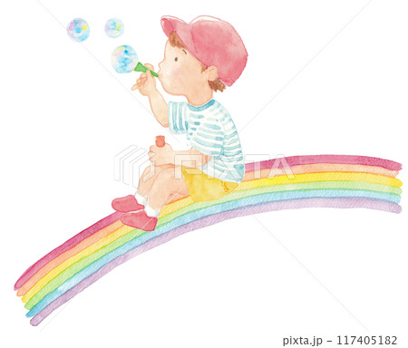 手描き水彩イラスト素材 虹に座りしゃぼん玉を吹く男の子