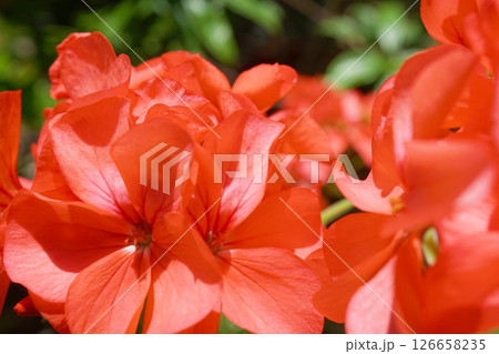 Bright red Rosa Satchmo floribunda roses blooming in a sunny garden, with lush green leaves and soft light creating a vibrant summer floral scene.