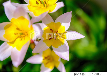 春の公園に咲く黄色と紫のパンジーの花と白と赤のチューリップの花