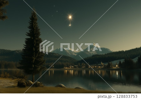 Morning Serenity at a Mountain Lake with Reflections of Snow-Capped Peaks and Lush Forests