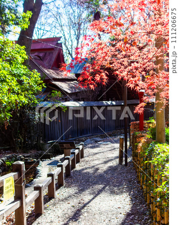 静岡県 熱海梅園の色鮮やかな紅葉と休憩スペースと道案内