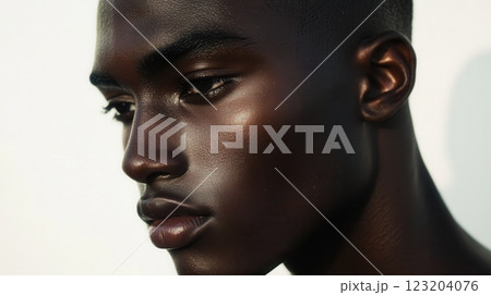 Close-up portraits of a Black man and woman with glowing skin, high contrast lighting, and smooth textures