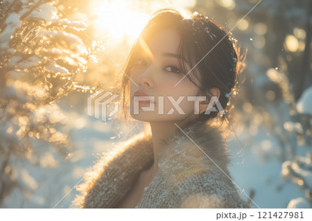 雪降る森で微笑む美しい日本人女性と木漏れ日-実写スタイル-