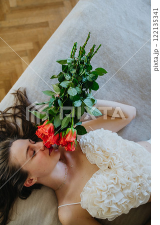 Sensual woman lying on bed smelling red rose. Concept of Valentine's Day, love and relationship