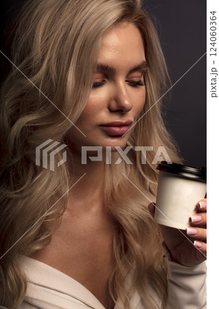 Young attractive girl posing in a white dress with a cup of coffee in modern kitchen