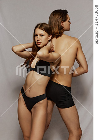 Comfort and acceptance Handsome man and beautiful woman, young model posing in underwear with fit and slim bodies