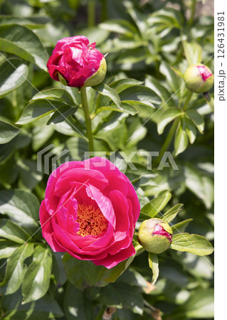 Peonies bush in the garden in countryside. Flower backgrounf for design. Summer floral photo